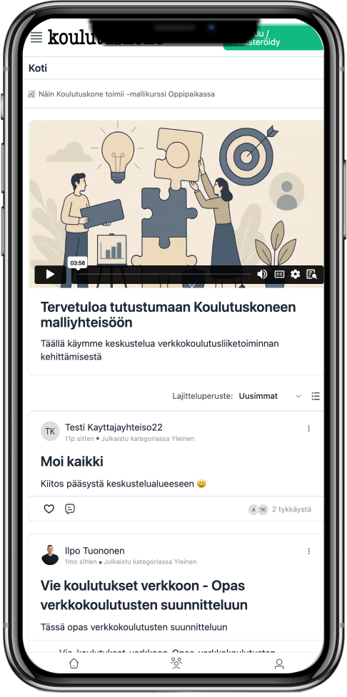 Sivusto. Verkkokurssit. Verkkokauppa. Yhteisö. CRM ja asiakasviestintä. Automaatiot. Koulutuskone on modulaarinen alusta, joka kasvaa liiketoimintasi mukana.